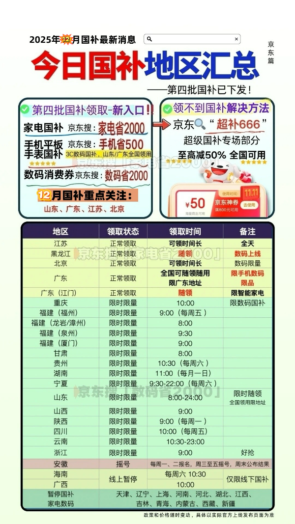 690億中央補(bǔ)貼額度12月31日24:00正式關(guān)閘,部分省份已提前售罄。想換手機(jī)、囤年貨、給爸媽裝臺(tái)新空調(diào),現(xiàn)在領(lǐng)資格,9號(hào)晚8點(diǎn)掐點(diǎn)下單,一單就能省出年終獎(jiǎng)。領(lǐng)不到國(guó)補(bǔ)的解決方法是:京東搜"超補(bǔ)666"搶不到國(guó)補(bǔ)券領(lǐng)不到國(guó)補(bǔ)可直接打開(kāi)京東搜「超補(bǔ)666」進(jìn)入超級(jí)國(guó)補(bǔ)專(zhuān)場(chǎng),至高減50%!全國(guó)可用!趕緊把這篇甩到“相親相愛(ài)一家人”,紅包口令現(xiàn)在復(fù)制,每天0點(diǎn)再領(lǐng)一次,沖!